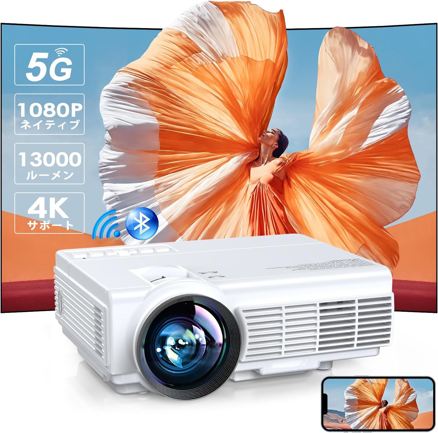 13000ルーメン高輝度&ネイティブ1080P&4K対応市販のホームプロジェクターと比べると、女性でも片手で持ち運べる手のひらのサイズなのに明るさを13000ルーメンまであげて、鮮明で高品質な投影効果を実現されて、映画の字幕をクリアに見えます。繊細な描写によって映像をより正確に再現します。且つ4Kソース対応して、綺麗な再生を楽しめます。コンパクトと高輝度画質を両立させます。夜間*ご注意:本製品は真のFHD解像度(1080P フルHD)です。市販に販売される他の安いプロジェクターはネイティブ1080Pと書いてありますが、実際は720Pです。あらかじめご了承ください。